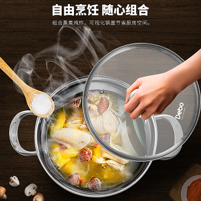 燉,蒸,煮,油炸全能鍋,獨(dú)創(chuàng)造型,外觀新穎時(shí)尚,擁有獨(dú)家設(shè)計(jì)專(zhuān)利。全功能設(shè)計(jì),配有蒸格以及油炸濾網(wǎng),蒸、煮、炸、燉無(wú)所不能。材質(zhì)精選304醫(yī)用不銹鋼鋼制作,耐酸、耐堿、耐腐蝕,長(zhǎng)期使用安全健康。鍋蓋采用鋼化玻璃組合設(shè)計(jì),鍋蓋與鍋沿的緊密配合產(chǎn)生“水封效果”有效確保食物營(yíng)養(yǎng)成分不流失;